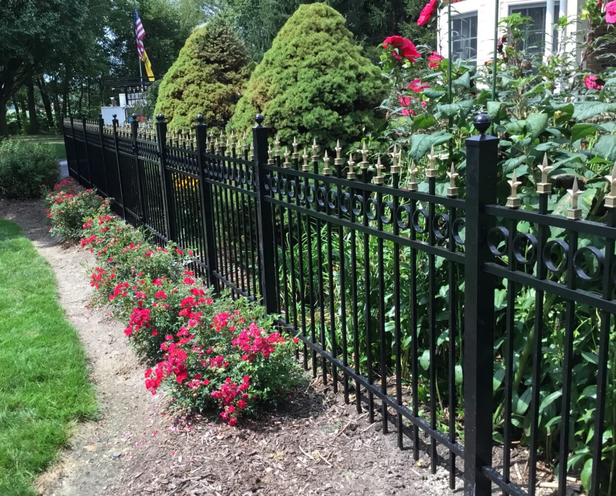Envelop your cherished flower garden with a gleaming aluminum fence for an unhindered view.